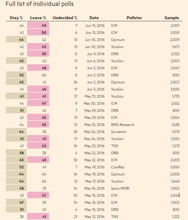 Αναφέρεται πως με βάση τον μέσο όρο των τελευταίων 20 δημοσκοπήσεων, το Brexit προηγείται με 45%, όταν το «ΝΑΙ στην Ε.Ε.» λαμβάνει 43%.