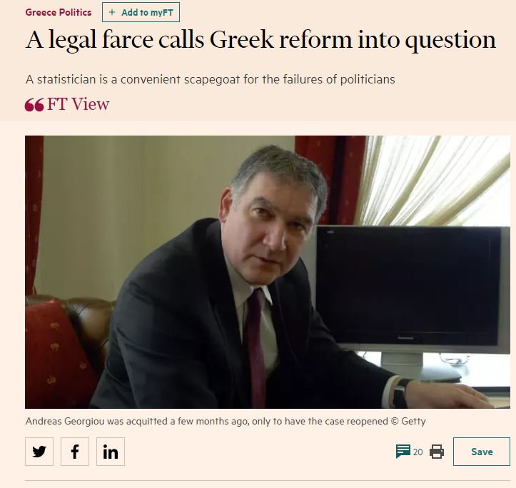 Αυτό αναφέρει νέα ανάλυση των Financial Times, υπό τον τίτλο "A legal farce calls Greek reform into question", αναφερόμενη για ακόμη μία φορά στην υπόθεση της καταδίκης του πρώην επικεφαλής της ΕΛΣΤΑΤ, Ανδρέα Γεωργίου.