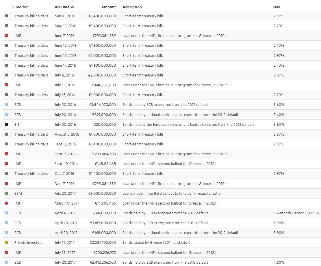 Να σημειωθεί ότι τον Ιούνιο η Ελλάδα πρέπει να πληρώσει 748 εκατ στο ΔΝΤ και στην ΕΚΤ 2,27 δισεκ. στις 20 Ιουλίου του 2016.