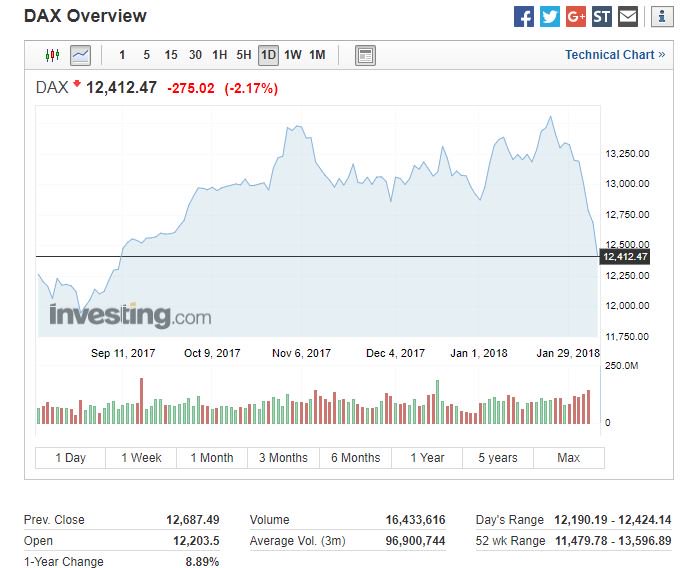 Ο DAX στη Φρανκφούρτη καταγράφει απώλειες 2,4% και κινείται στις 12.379 μονάδες.
