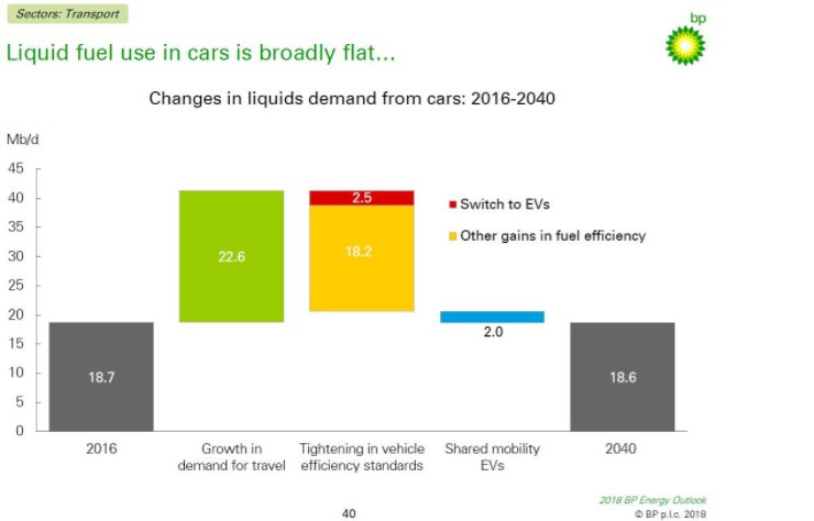 Σε αντίθεση με άλλες προβλέψεις, συμπεριλαμβανομένων των προηγούμενων της BP Energy, οι οποίες έβλεπαν αποκλειστικά το αυξανόμενο μερίδιο των EV, η BP το 2018 επικεντρώθηκε στο μερίδιο των οχημάτων που κινούνται με ηλεκτρισμό.