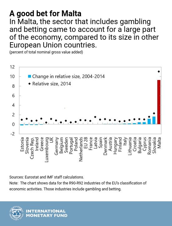 Στον τομέα αυτό, το πλεονέκτημα της Μάλτας έναντι της υπόλοιπης Ε.Ε. είναι «συγκλονιστικό», τόσο στο σχετικό μέγεθος της βιομηχανίας τυχερών παιχνιδιών (σχεδόν 12% της συνολικής ακαθάριστης προστιθέμενης αξίας της Μάλτας, το 2016) όσο και στην οικονομική ανάπτυξη (το μερίδιο στην ακαθάριστη προστιθέμενη αξία της Μάλτας αυξήθηκε με 9 ποσοστιαίες μονάδες, μεταξύ 2004 και 2014), επισημαίνεται.
