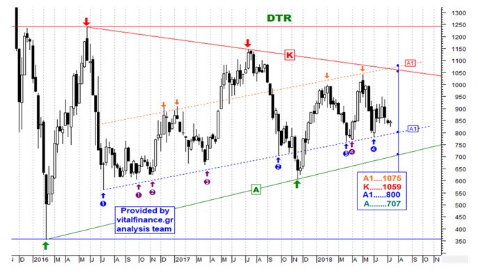 Τα όρια του τριγωνικού σχηματισμού καθορίστηκαν με δύο επαφές των γραμμών Κ και Α με την τιμή του δείκτη με τελευταία επαφή το Νοε του 2017.