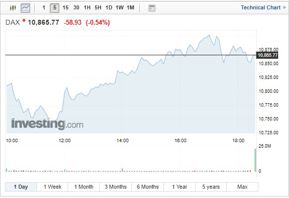Ο DAX στη Φρανκφούρτη υποχώρησε κατά 0,54% κι έκλεισε στις 10.865,77 μονάδες, έχοντας νωρίτερα σημειώσει βουτιά έως και 1,7%.