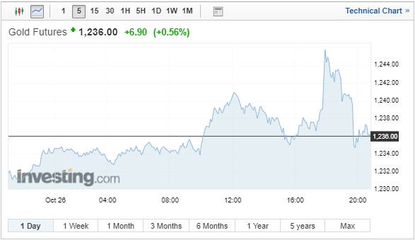 Η τιμή του συμβολαίου του χρυσού παραδόσεως Δεκεμβρίου έκλεισε σήμερα με κέρδη 0,3% ή 3,40 δολ. στα 1.235,80 δολ. ανά ουγγιά, μόλις 1 δολάριο κάτω του υψηλού σχεδόν 3 μηνών που είχε «αγγίξει» την Τρίτη (23/10).