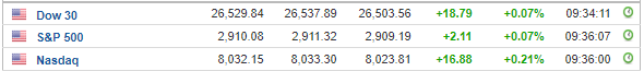 Περί τις 16:30, ο Dow Jones ενισχύεται κατά 0,1% στις 26.538 μονάδες, ο S&P 500 σημειώνει άνοδο 0,2% στις 2.913 μονάδες, ενώ ο Nasdaq κινείται κατά 0,3% υψηλότερα στις 8.040 μονάδες.