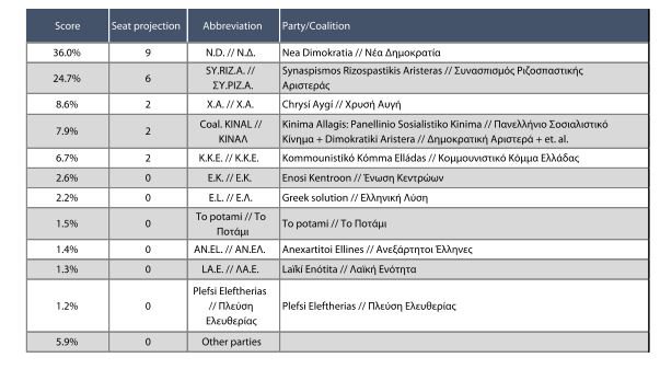 Η ΝΔ αναμένεται να εκλέξει 9 έδρες στο Ευρωπαϊκό Κοινοβούλιο, ο ΣΥΡΙΖΑ 6, η Χρυσή Αυγή 2 έδρες, το ΚΙΝΑΛ 2 έδρες και το ΚΚΕ 2 έδρες