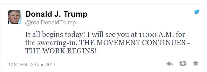 Μήνυμα στο twitter, στο οποίο γράφει ότι «όλα αρχίζουν σήμερα» ανέβασε λίγο πριν την ορκωμοσία του ως 45ος πρόεδρος των ΗΠΑ, ο Donald Trump.
