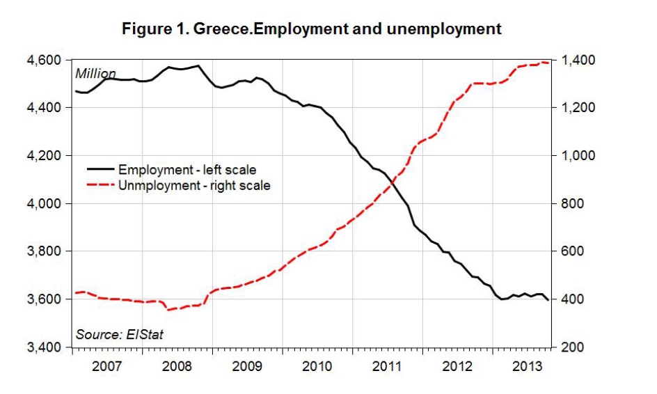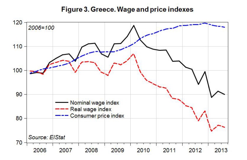 Η συνταγή της τρόικας - με επίκεντρο την εσωτερική υποτίμηση - δεν έχει οδηγήσει την Ελλάδα μακριά από το φαύλο κύκλο της ύφεσης.