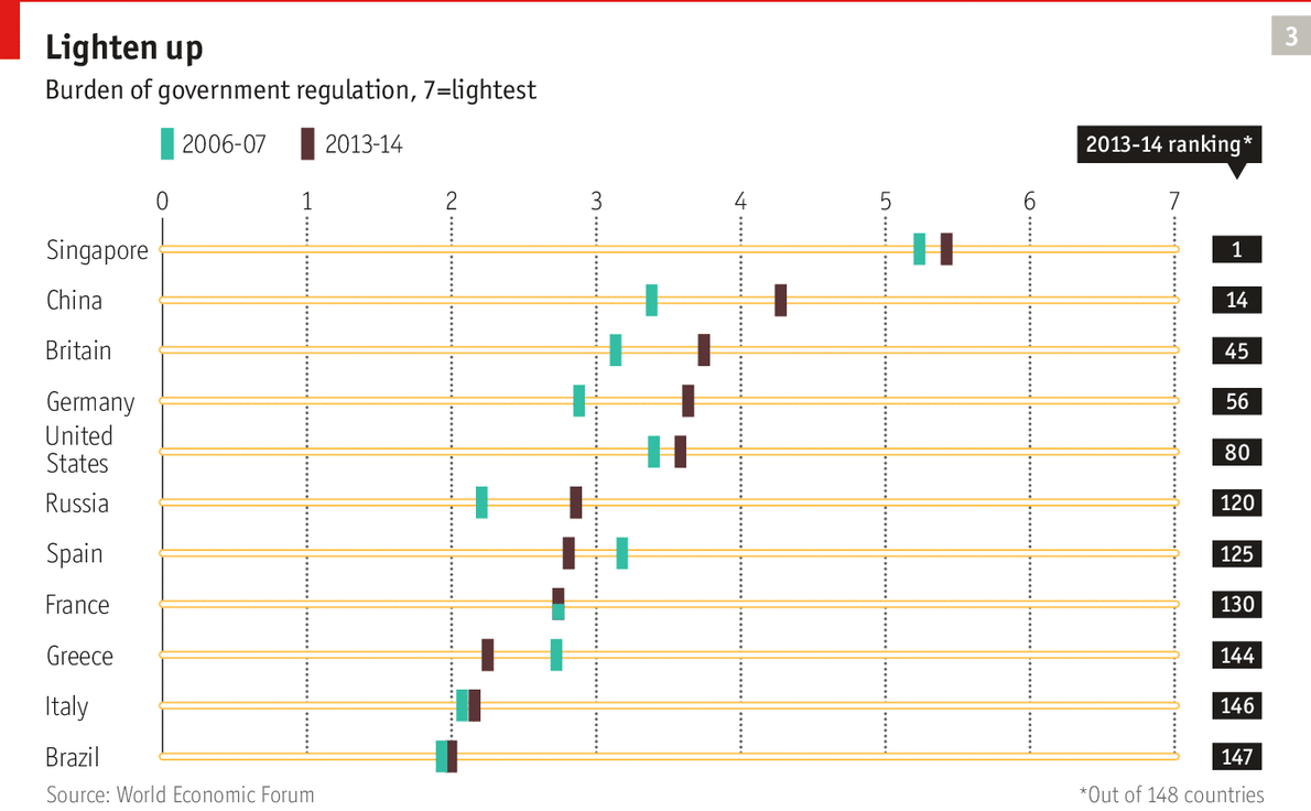 Υπό τον τίτλο «Regulation Tangled», το οικονομικό περιοδικό αξιολογεί τις χώρες βάσει των εμποδίων στην κρατική τους λειτουργία για το έτος 2013.