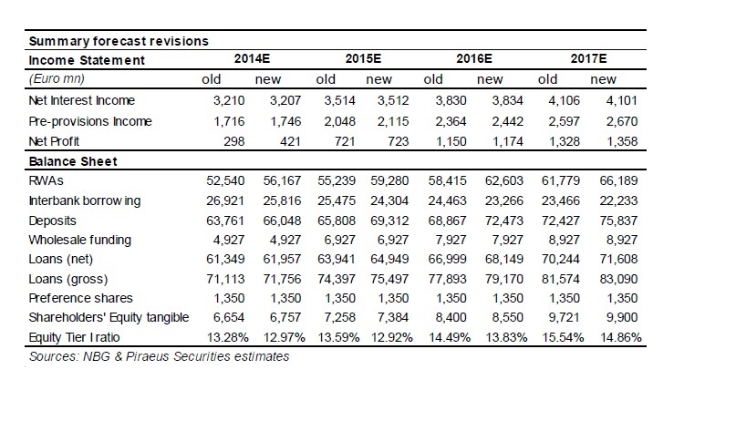 Για το σύνολο του 2014, η Piraeus Sec προβλέπει πως η Εθνική θα ανακοινώσει καθαρά κέρδη ύψους 421 εκατ. ευρώ