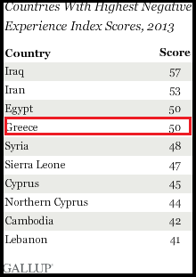 Σύμφωνα με παγκόσμια έρευνα της Gallup, η Ελλάδα βρίσκεται στην 4η θέση των πιο δυστυχισμένων χωρών, υπερβαίνοντας ακόμη και τη Συρία, η οποία τα τελευταία τρία χρόνια ταλανίζεται από τον εμφύλιο πόλεμο.