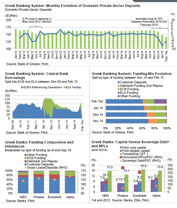 Σύμφωνα με τα στοιχεία που παρουσιάζει η Fitch, οι καταθέσεις στις ελληνικές τράπεζες έχουν μειωθεί κατά περίπου -15% από τα τέλη Νοεμβρίου του 2014, έως και σήμερα.