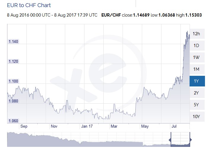 Το τελευταίο διάστημα όμως παρατηρείται μια ανάκαμψη του ευρώ έναντι του ελβετικού φράγκου και από το 1 ευρώ προς 1,09 ελβετικά φράγκα αρχές Ιουλίου 2017 έχει αναρριχηθεί στα 1,1530 – 1,1467 ελβετικά φράγκα.