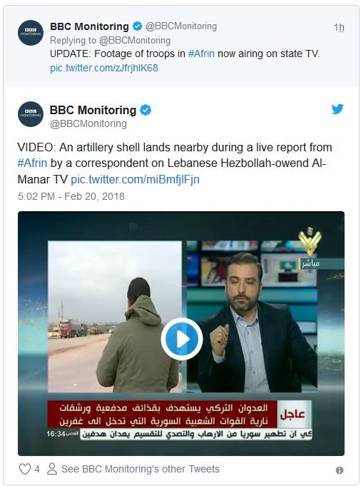 Λίγη ώρα αφότου η αυτοκινητοπομπή μπήκε στο Afrin, τα κρατικά συριακά μέσα ενημέρωσης μετέδωσαν ότι η Τουρκία στοχοθέτησε τους μαχητές και τους βομβάρδισε.