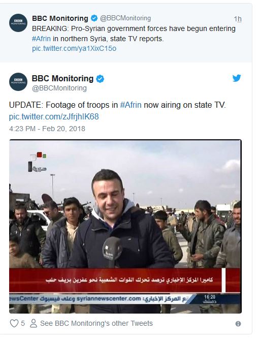 Την Δευτέρα (18/2) η Τουρκία προειδοποίησε ότι θα συγκρουστεί με τις κυβερνητικές δυνάμεις αν μπουν στο Afrinγια να βοηθήσουν τις YPG, αλλά δεν θα σταθεί εμπόδιο αν στόχος τους είναι να εκκαθαρίσουν την περιοχή από τους Κούρδους μαχητές.