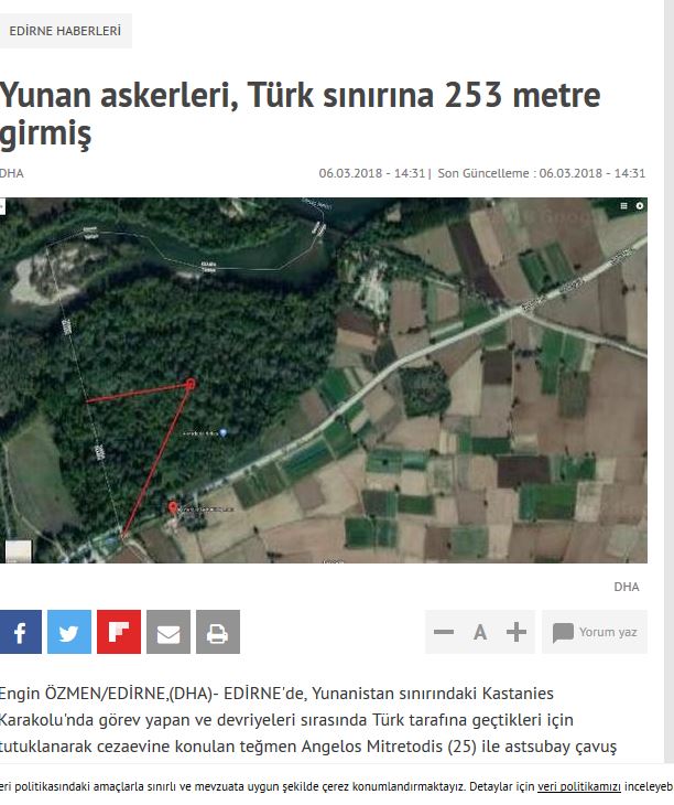 Τεταμένο κλίμα προσπαθούν να δημιουργήσουν τα Τουρκικά ΜΜΕ και ειδικά η Hurriyet η οποία σε δημοσίευμά της αναφέρει πως οι δύο Έλληνες στρατιωτικοί δεν παραβίασαν απλά την συνοριογραμμή αλλά πέρασαν στο τουρκικό έδαφος κατά 240 μέτρα.