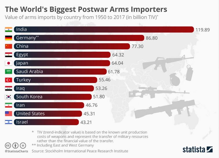 Στην πραγματικότητα, όπως δείχνει το παρακάτω γράφημα, η Ινδία κατέβαλε τα περισσότερα χρήματα για εισαγωγές όπλων τα τελευταία πέντε χρόνια σύμφωνα με νέα στοιχεία του Διεθνούς Ινστιτούτου Ερευνών της Στοκχόλμης (Sipri) της Στοκχόλμης.