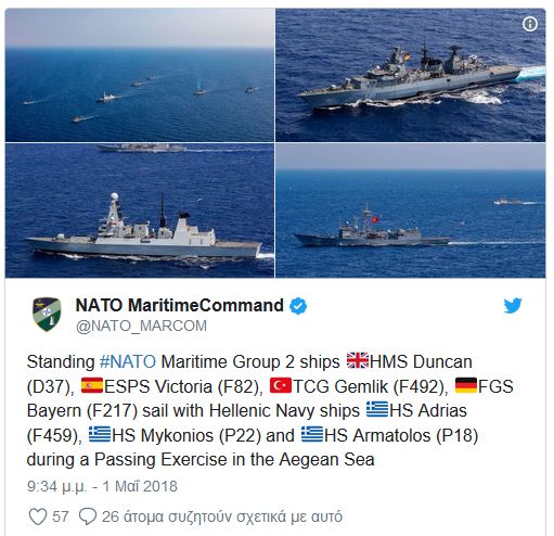 Η όλη αντίφαση και παραδοξότητα που δημιουργείται με υπαιτιότητα της Τουρκίας αλλά και της Συμμαχίας, είναι πλήρως εμφανής από το γεγονός ότι ταυτόχρονα με την εν εξελίξει τουρκική αποβατική άσκηση «EFES 2018» και τον βομβαρδισμό του διαδικτύου και των τουρκικών ΜΜΕ με την εικόνα του εγκλωβισμού ελληνικών νησιών και θαλάσσιων περιοχών, που επιχειρείται να προσδώσουν τα σενάρια της άσκησης, διενεργείται στο Αιγαίο και η άσκηση συνεκπαίδευσης ναυτικών μονάδων του ΝΑΤΟ, με συμμετοχή της τουρκικής φρεγάτας TCG Gemlik κι ελληνικών σκαφών.