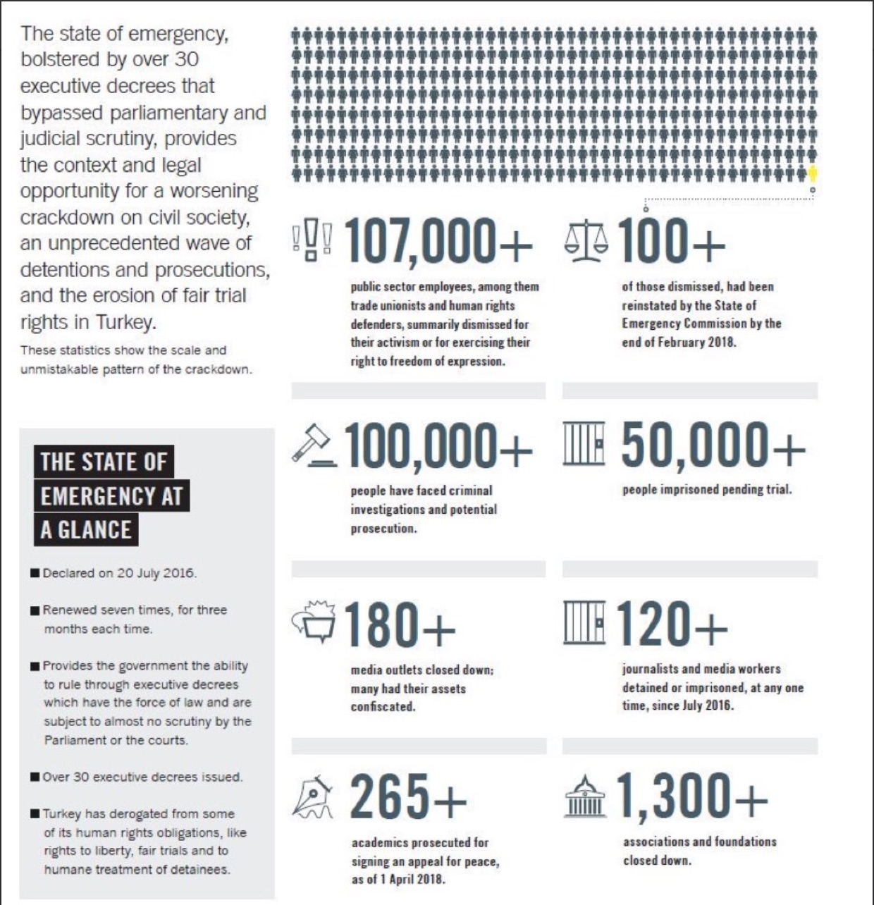 Η κατάσταση έκτακτης ανάγκης, ενισχύεται με πάνω από 30 εκτελεστικά διατάγματα με τα οποία παρακάμφθηκε ο κοινοβουλευτικός και δικαστικός έλεγχος, παρέχουν το πλαίσιο και τη νομική δυνατότητα για την επιδείνωση της καταστολής της κοινωνίας των πολιτών, ένα άνευ προηγουμένου κύμα των κρατήσεων και των διώξεων, και τη διάβρωση του δικαιώματος για δίκαιη δίκη στην Τουρκία.