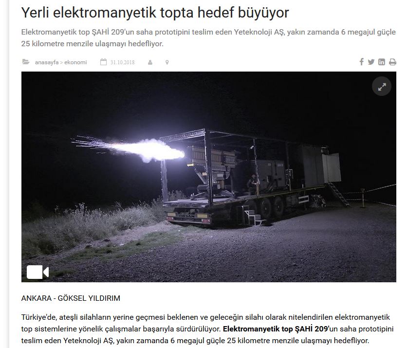Το ηλεκτρομαγνητικό πυροβόλο ŞAHİ 209 της Yeteknoloji AS πέρασε με επιτυχία τις δοκιμές πεδίου στις οποίες υποβλήθηκε, καθώς χτύπησε στόχους ακόμα και σε αποστάσεις 25 χιλιομέτρων.