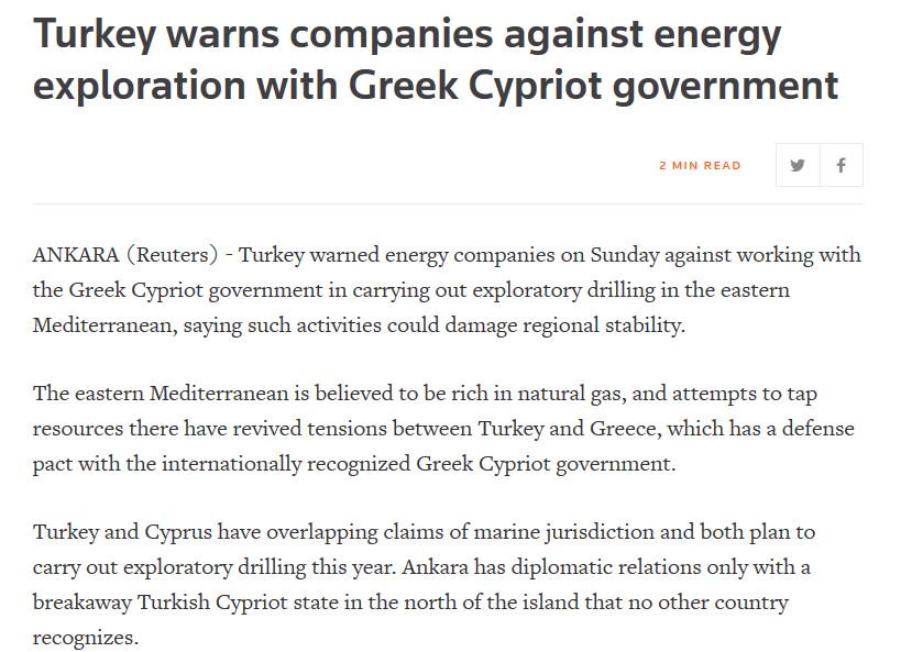 Η Τουρκία προειδοποιεί τους ενεργειακούς κολοσσούς ενάντια στη συνεργασία τους με την ελληνοκυπριακή κυβέρνηση για ρη διεξαγωγή διερευνητικών γεωτρήσεων στην ανατολική Μεσόγειο, αναφέρει το Reuters.
