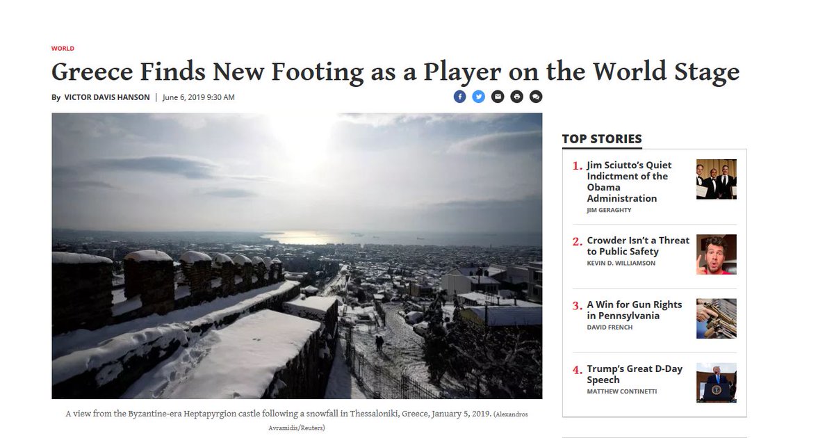 Υπό τον τίτλο «Greece Finds New Footing as a Player on the World Stage», άρθρο του γνωστού αναλυτή/συγγραφέα στρατιωτικής ιστορίας Victor Davis Hanson στους WASHINGTON TIMΕS και στο περιοδικό NATIONAL REVIEW, κάνει λόγο για αναβάθμιση του ρόλου της Ελλάδας στην γεωπολιτική σκηνή, από τη νέα ‘realpolitik’ που ακολουθεί τελευταία με την διαφοροποίηση της εξωτερικής της πολιτικής, εξισορροπώντας μεταξύ της αντιμετώπισης ιστορικών εχθρών και της οικοδόμησης σταθερών συμφερόντων με νέους συμμάχους.