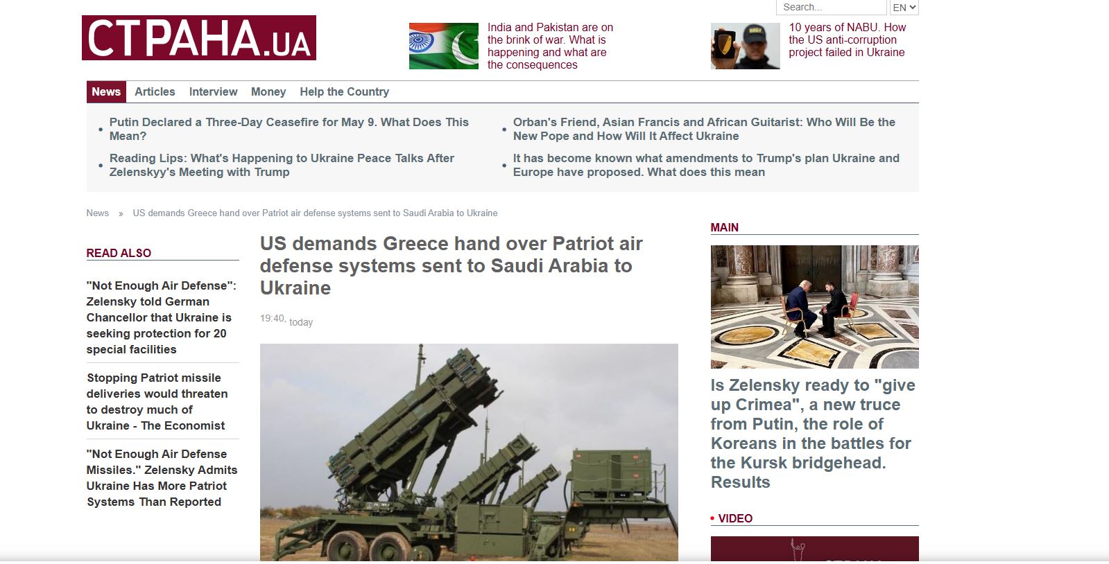Οι Ηνωμένες Πολιτείες απαιτούν από την Ελλάδα να παραδώσει στην Ουκρανία τα συστήματα αντιαεροπορικής άμυνας Patriot που είχαν αποσταλεί στη Σαουδική Αραβία, όπως αποκαλύπτει η ουκρανική Strana