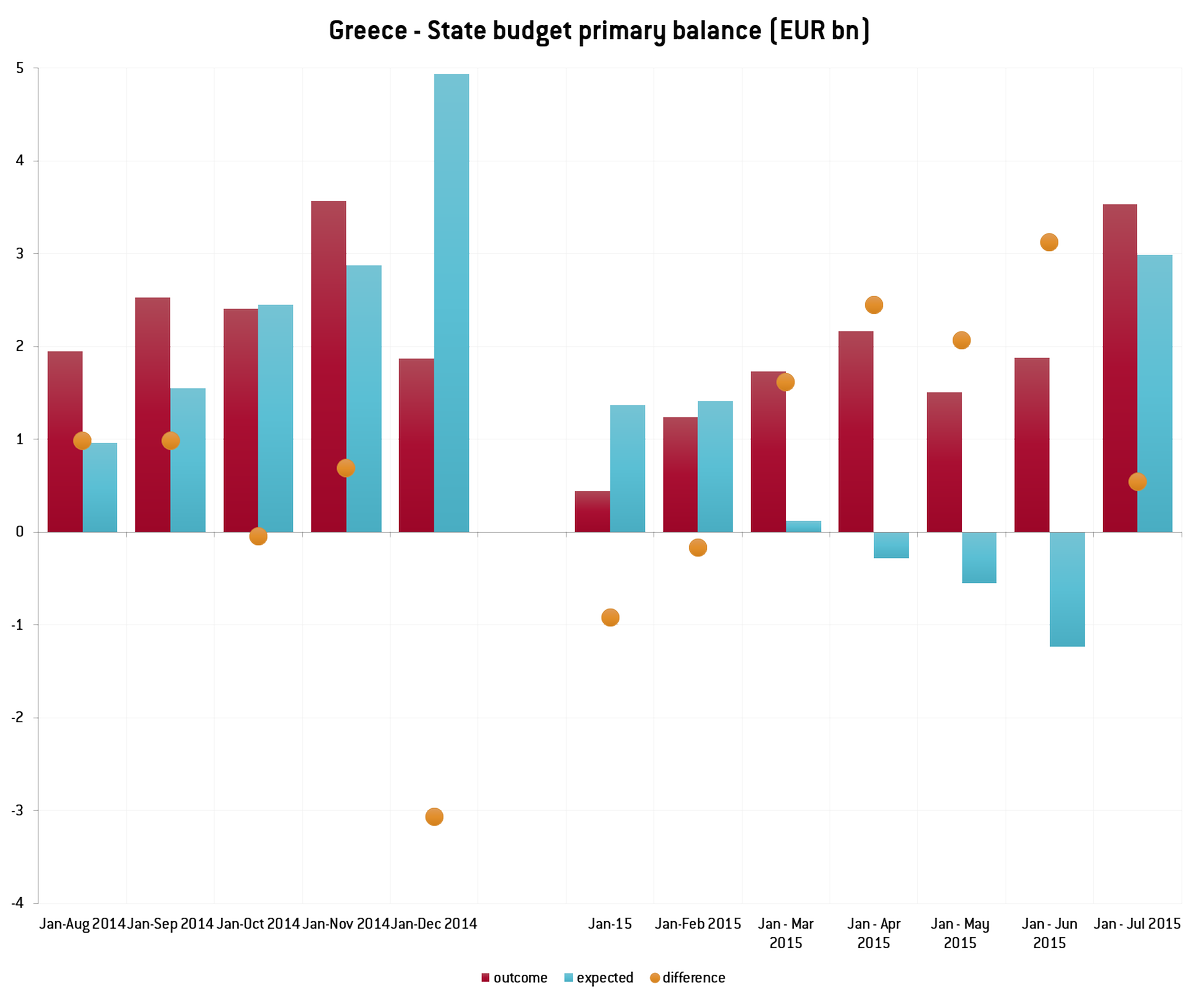Το σωρευτικό πρωτογενές πλεόνασμα που επιτεύχθηκε τον Ιούλιο του 2015 ανήλθε σε περίπου 2% του ελληνικού ΑΕΠ το 2014.