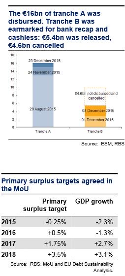 Σύμφωνα με τη σημερινή 8/4/2016 9σέλιδη ανάλυσή της υπό τον τίτλο «What are you doing this summer? Back to Greece» (τι κάνουμε αυτό το καλοκαίρι; Επιστροφή στην Ελλάδα), που σας παρουσιάζει το www.bankingnews.gr, η Royal Bank of Scotland παρατηρεί ότι το ΔΝΤ συμμετέχει στο σχεδιασμό του προγράμματος, αλλά απαιτεί δύο προϋποθέσεις για να αρχίσει να συνεισφέρει οικονομικά: (i) την ολοκλήρωση των μεταρρυθμίσεων και (ii) την ελάφρυνση του ελληνικού χρέους.