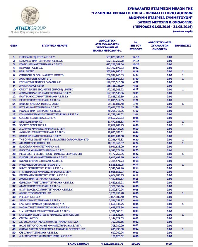 Στην πρώτη θέση κατατάσσεται η χρηματιστηριακή Eurobank Equities για τον μήνα Μάιο, όσον αφορά τις συναλλαγές στο Χρηματιστήριο της Αθήνας, με ποσοστό 14,18%.