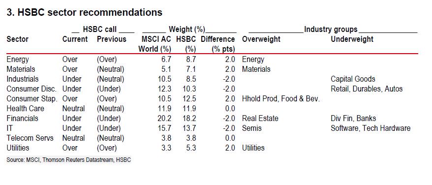 Αναφορικά με τους επιμέρους κλάδους, η HSBC παραμένει overweight για τον κλάδο κοινής ωφελείας και κατανάλωσης, της ενέργειας και των υλικών, καθώς και του real estate.