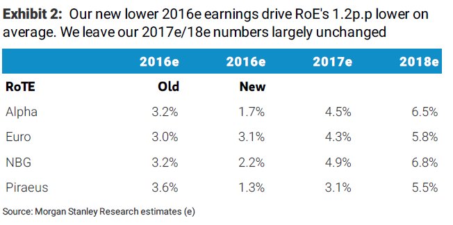 Κατά 1,2 μ.β. κατά μέσο όρο μειώνει τις εκτιμήσεις για τα κέρδη των ελληνικών τραπεζών η Morgan Stanley, εξαιτίας της χαμηλότερης εκτίμησης, κατά το ίδιο ποσοστό των δεικτών ROEs (return on equity) του κλάδου.
