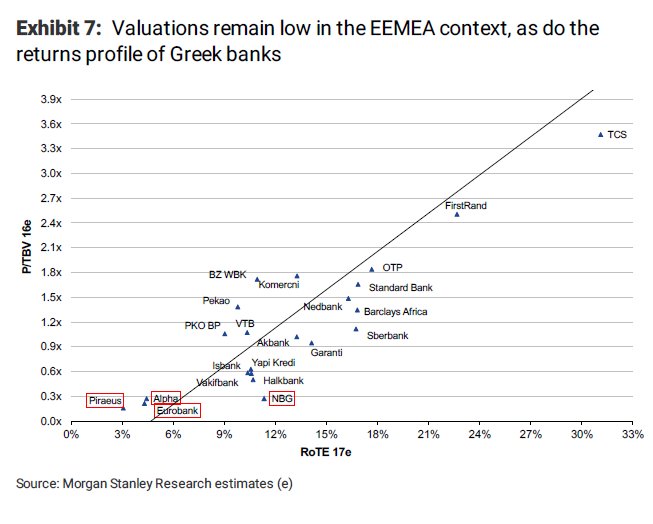 Οι αποτιμήσεις των ελληνικών τραπεζών παραμένουν κοντά στα κατώτερα επίπεδα της σύσταση equalweight, ενώ οι προσπάθειες για τη βελτίωση των δεικτών ROEs παραμένουν χρονοβόρες.