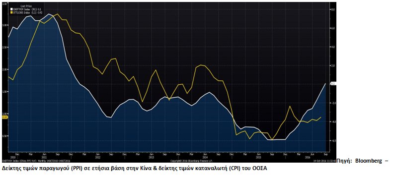 Το διάγραμμα παρουσιάζει τον δείκτη τιμών παραγωγού σε ετήσια βάση στην Κίνα (θετικός πλέον), και πώς συσχετίζεται με τον πληθωρισμό τιμών καταναλωτή του ΟΟΣΑ.