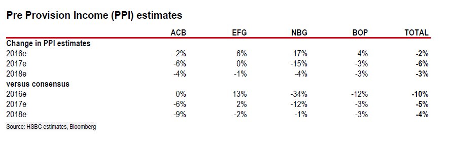 Υπό αυτό το πρίσμα, η HSBC μειώνει τις εκτιμήσεις της για τα προ προβλέψεων κέρδη των τραπεζών κατά 1%, 6% και 3% αντίστοιχα τα έτη 2016, 2017 και 2018.