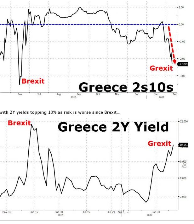 Όπως σχολιάζει το ZeroHegde με αφορμή την εκτόξευση της απόδοσης του 2ετούς ελληνικού ομολόγου πάνω από το 10%, οι διαφωνίες μεταξύ των δανειστών για το τρίτο ελληνικό πρόγραμμα επαναφέρουν την ανησυχία για έξοδο της Ελλάδας από το ευρώ και επιστροφή στη δραχμή.