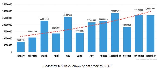 · Ο όγκος των spam email το 2016 αυξήθηκε αγγίζοντας το 58,31% της συνολικής κίνησης των email, μια αύξηση της τάξης του 3,03% σε σύγκριση με το 2015.