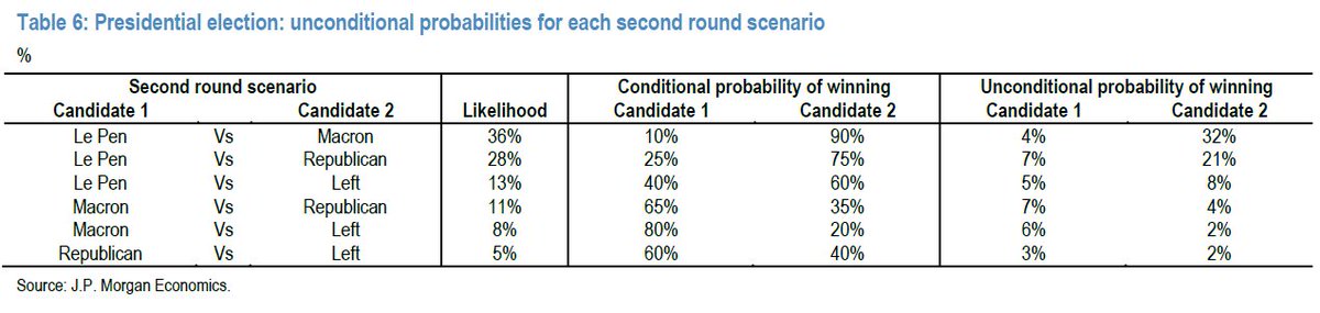Σύμφωνα με την τελευταία ανάλυση της JP Morgan Cazenove, ακόμη και αν εκλεγεί η Le Pen στη γαλλική προεδρία, η πλεοψηφία της στη γαλλική βουλή είναι σχεδόν απίθανο να επιτευχθεί.