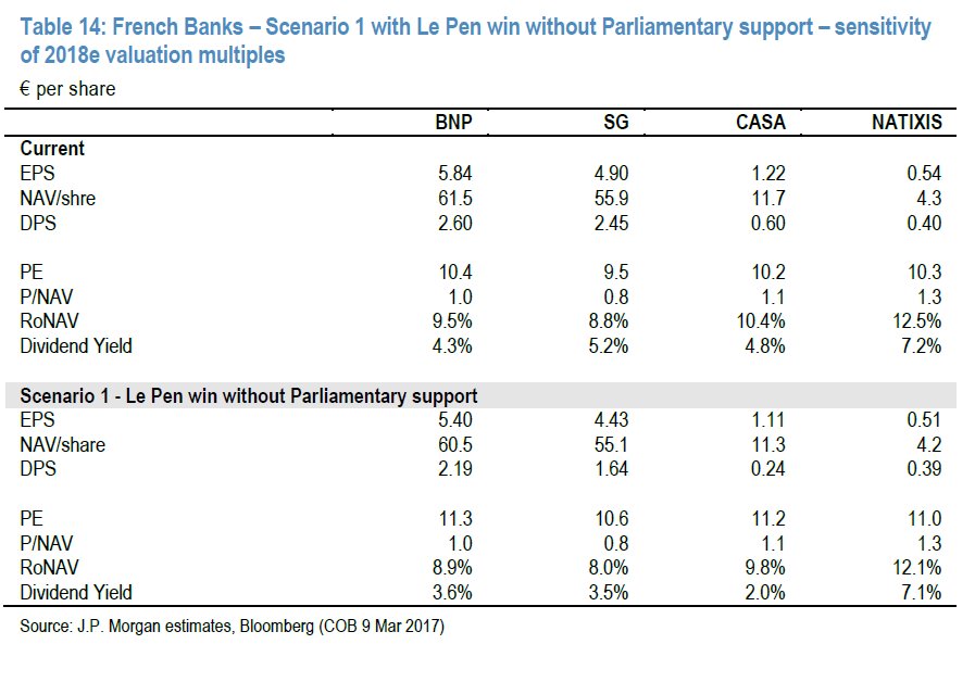 Μπορεί το Frexit να ένα πολύ απομακρυσμένο σενάριο, ακόμη και αν υποτεθεί μια πιθανότητα 16% για τη νίκη Le Pen, η JP Morgan Cazenove θεωρεί ότι σε ένα τέτοιο ενδεχόμενοι οι αποτιμήσεις των γαλλικών τραπεζών θα είναι υψηλές.