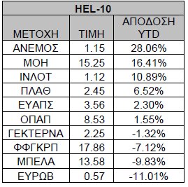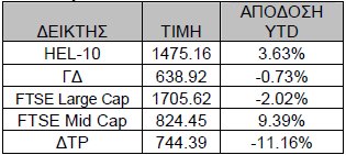 Ο FTSE Mid Cap και ο HEL-10 παρουσιάζουν αξιοπρεπείς θετικές αποδόσεις ενώ ο ΔΤΡ παρουσιάζει απώλειες 11% YTD.
