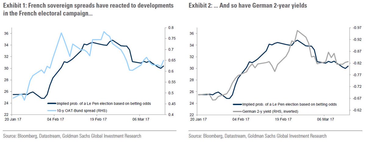Επίσης τα spreads αναμένεται να διευρυνθούν σημαντικά, όπως τονίζεται στην ανάλυση με τίτλο «Frexit: What should you expect for European equities», με ημερομηνία 15 Μαρτίου 2017.