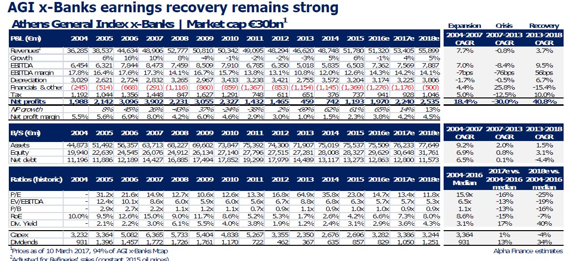 Αναφορικά με τις μη τραπεζικές μετοχές, η Alpha Finance τονίζει ότι διαπραγματεύονται με 13,4x σε όρους P/E του 2017, ενώ ο δείκτης των κερδών CAGR της περιόδου 2013-2018 (αψηφώντας το αδύναμο μακροοικονομικό περιβάλλον) προβλέπεται να είναι στο 41%.
