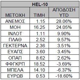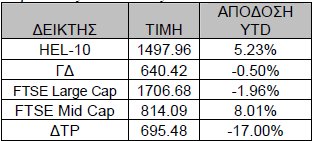 Ο FTSE Mid Cap και ο HEL-10 παρουσιάζουν αξιοπρεπείς θετικές αποδόσεις 5% και 8% από την αρχή του έτους ενώ ο ΔΤΡ παρουσιάζει απώλειες 17% YTD.