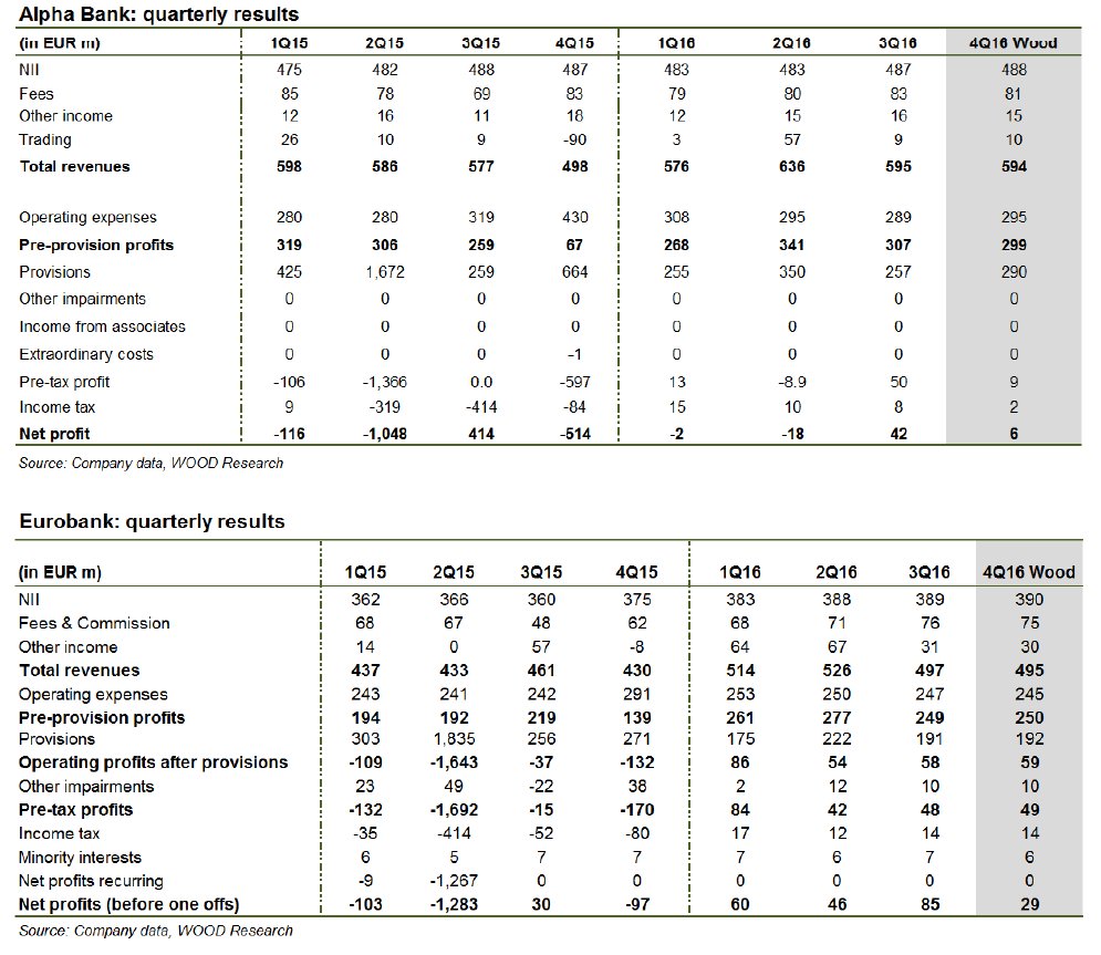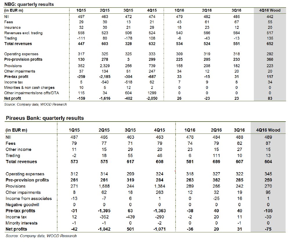 Στην σημερινή 6σέλιδη ανάλυσή της με τίτλο "Greek banks: uninspiring quarter; all eyes on 2017E (4Q previews, due out this week)" (Ελληνικές τράπεζες: κοινότοπο το δ' 3μηνο του 2016, όλα τα βλέμματα στο 2017), που σας παρουσιάζει το www.bankingnews.gr, η Wood εκτιμά πως δεν αναμένονται εκπλήξεις για το σύνολο του 2016.