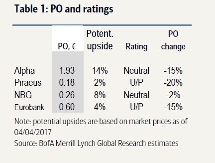 Επίσης, η Bank of America Merrill Lynch μειώνει τις τιμές στόχους των τραπεζών, στα 1,93 ευρώ για την Alpha Bank, από 2,27 ευρώ προηγουμένως, στα 0,18 ευρώ για την Πειραιώς, από 0,22 ευρώ, στα 0,26 ευρώ για την Εθνική, από 0,27 ευρώ και στα 0,60 ευρώ για τη Eurobank, από 0,70 ευρώ προηγουμένως.