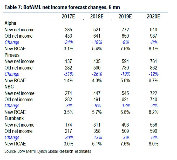 Στην σημερινή 25σέλιδη ανάλυσή της υπό τον τίτλο "EPS and POs down – no Buys" (μείωση των τιμών στόχων και των εκτιμήσεων για τα κέρδη ανα μετοχή - Όχι αγορές) που σας παρουσιάζει το www.bankingnews.gr, η Bank of America Merrill Lynch μειώνει τις εκτιμήσεις για τα κέρδη της 4ετίας 2017-2020 κατά 8-29%, αν και επισημαίνει ότι η τάση ανάκαμψης της κερδοφορίας θα συνεχιστεί.