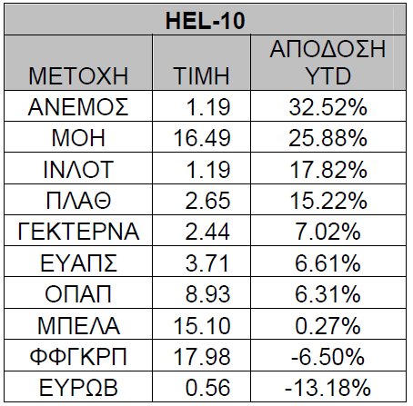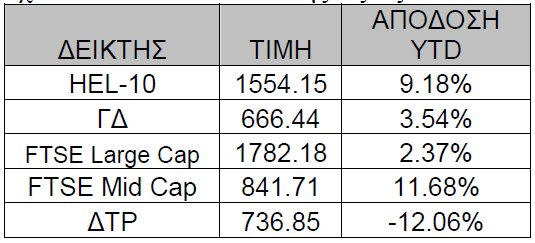Ο FTSE Mid Cap καταγράφει κέρδη κοντά στο 12% και ακολουθεί ο HEL-10 με απόδοση που ξεπερνά το 9% YTD τη στιγμή που ο ΔΤΡ έχει απωλέσει το 12% της αξίας του.