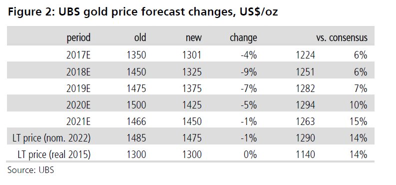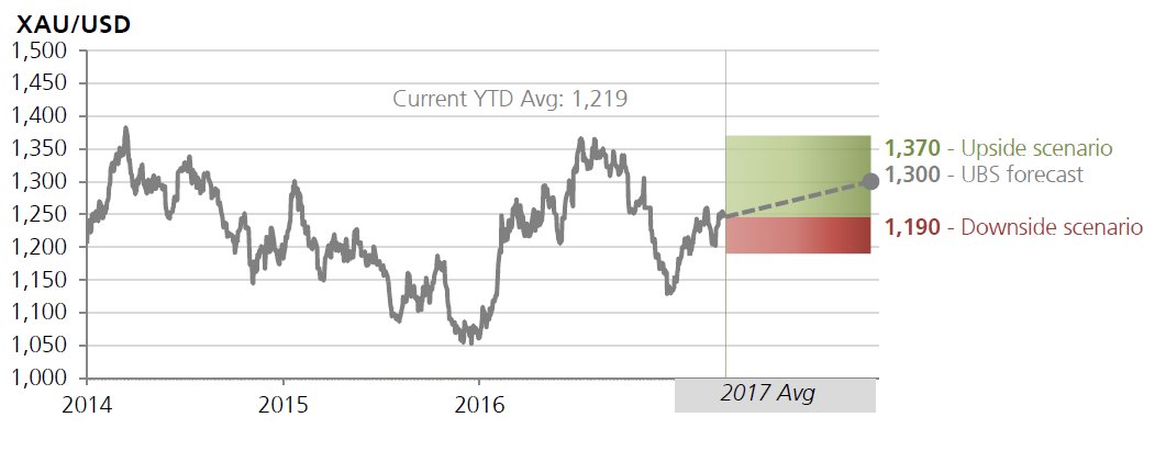 Σε μείωση των εκτιμήσεων για την πορεία του χρυσού προχώρησε η UBS, αναμένοντας να κυμανθεί στα 1.300 δολάρια το 2017, από 1.350 δολάρια προηγουμένως, και στα 1.325 δολάρια το 2018, από 1.450 δολάρια που ήταν η προηγούμενη εκτίμηση.