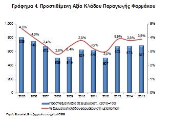 Η δυναμική του φαρμακευτικού κλάδου αποτυπώνεται στην ποσοστιαία συμμετοχή του στη βιομηχανική δραστηριότητα. Πιο συγκεκριμένα, η ακαθάριστη προστιθέμενη αξία του κλάδου (2010=100) διαμορφώθηκε σε 3,9% της συνολικής προστιθέμενης αξίας του μεταποιητικού τομέα το 2015 από 3,8% το 2014 (Γράφημα 4) και κατέχει σχετικά υψηλό μερίδιο συγκριτικά με τους υπόλοιπους κλάδους της μεταποίησης (8η θέση μεταξύ των 24 κλάδων της μεταποίησης για το 2015).